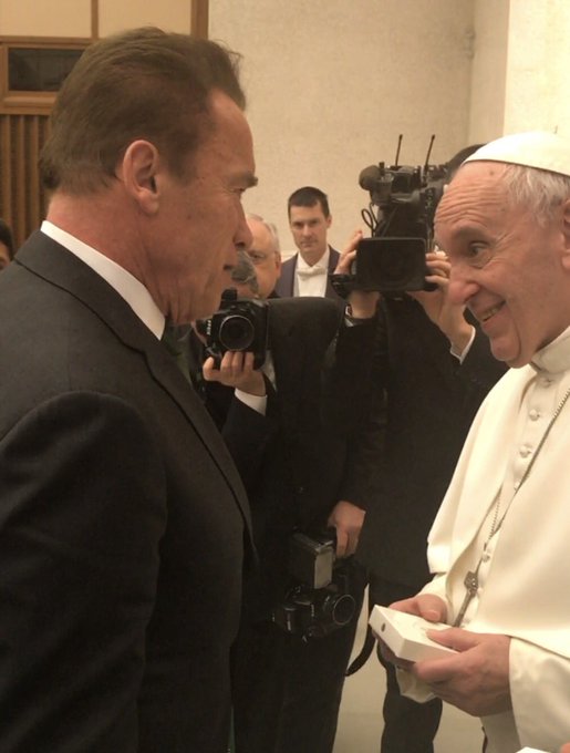 Arnold Schwarzenegger se somou à lista de celebridades que visitaram o Vaticano durante o Pontificado do Francisco. Entre eles figuram os cantores Andrea Bocelli e Plácido Domingo; os atores Leonardo Di Caprio, Angelina Jolie, Ralph Fiennes, Eduardo Verástegui, Martina Stoessel; o jogador de futebol argentino Lionel Messi, entre outros.
